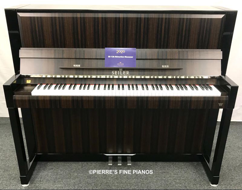 This particular SEILER SE-126 MACASSAR upright piano is one-of-a-kind CUSTOM FINISH made by the SEILER piano company.